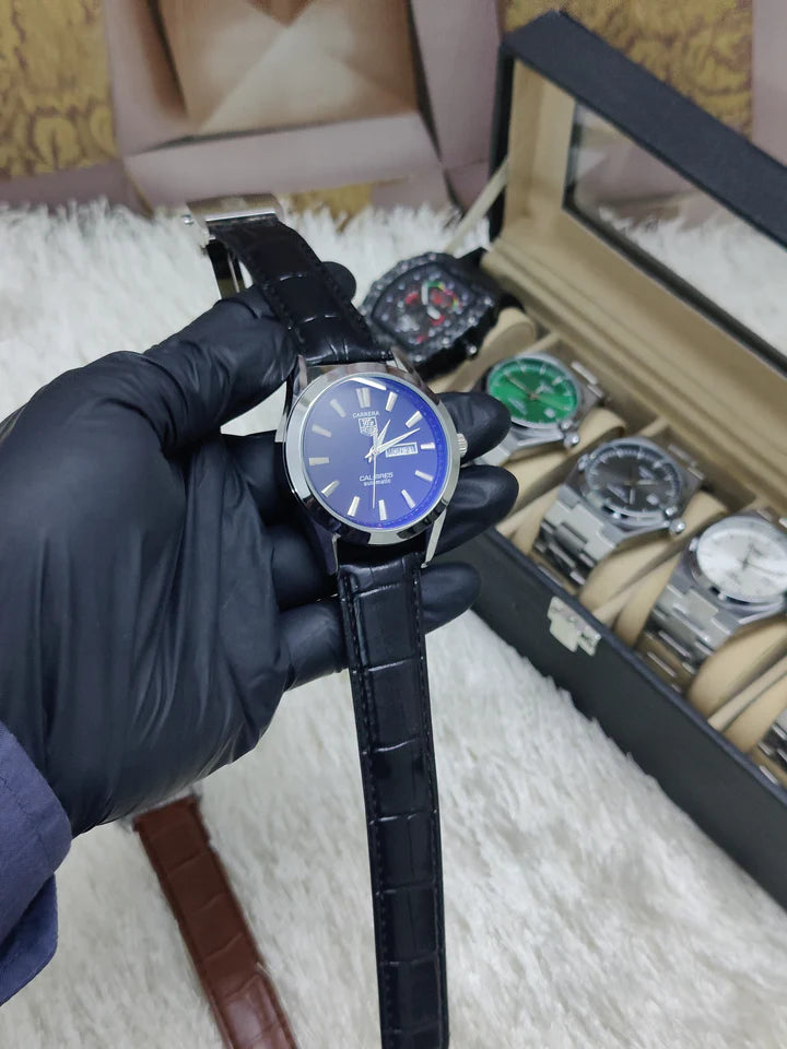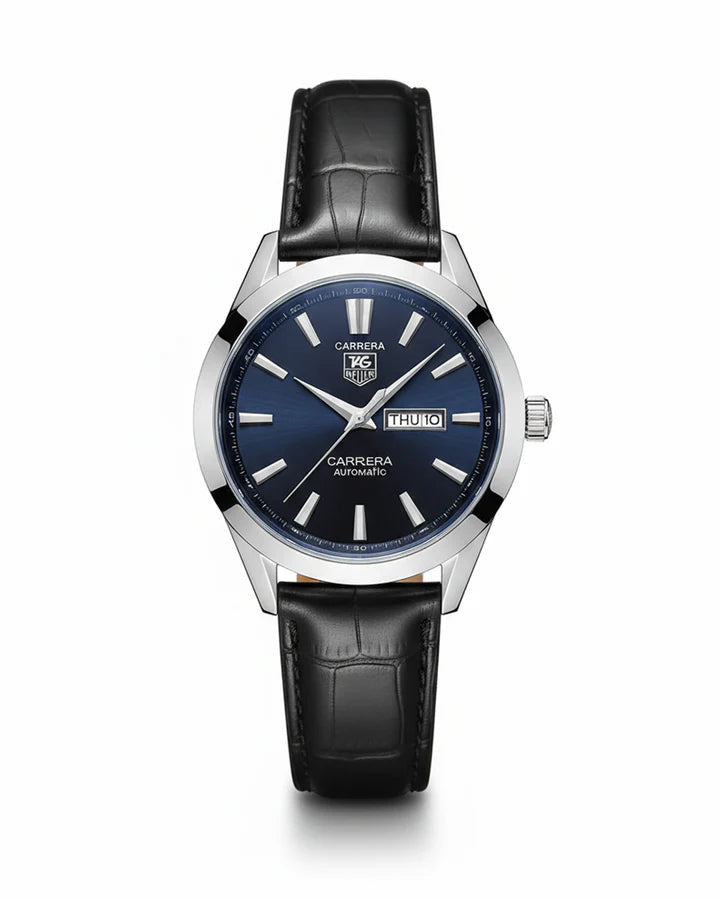 The Tag Heuer Carrera Calibre 5 Automatic embodies precision, heritage, and timeless design. Featuring a sleek black dial with polished silver-tone hour markers and a day-date display at 3 o’clock,...